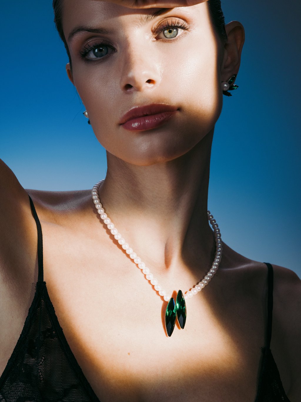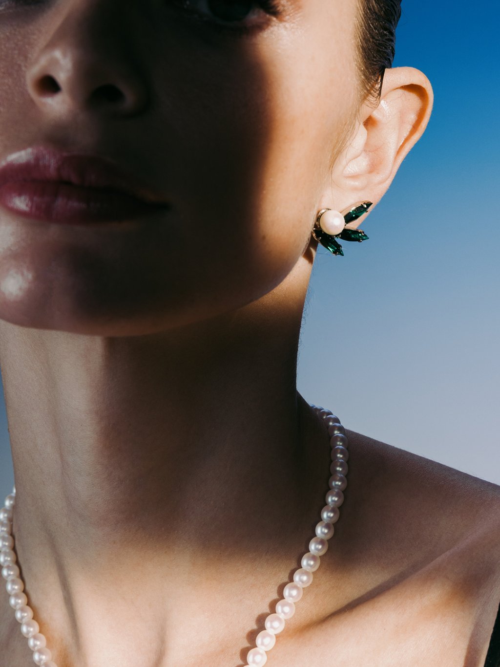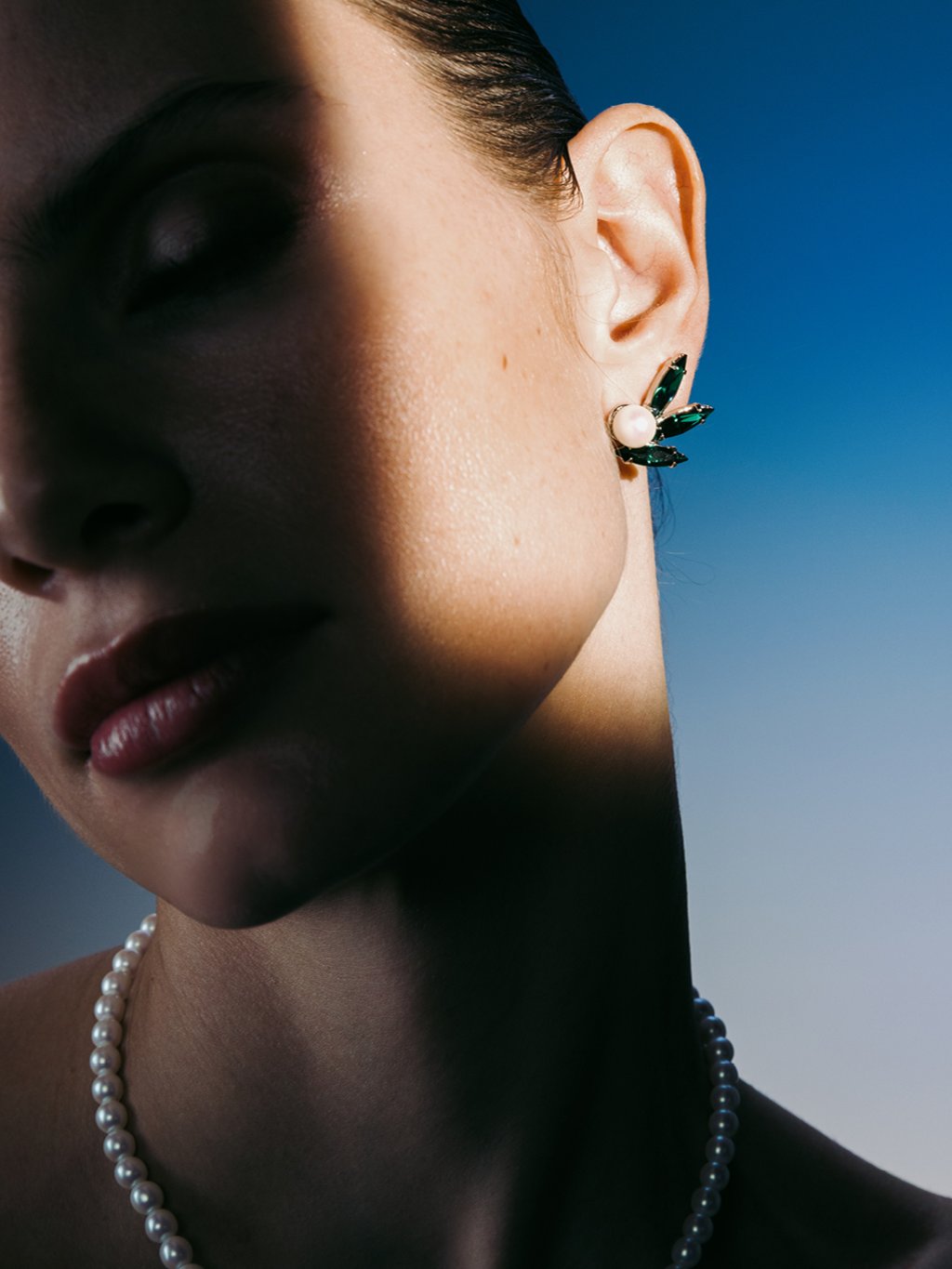 Náušnice Elysia v sobě spojují něžnost perel a dramatickou hloubku broušených kamenů českého křišťálu Preciosa v sytě smaragdové barvě.