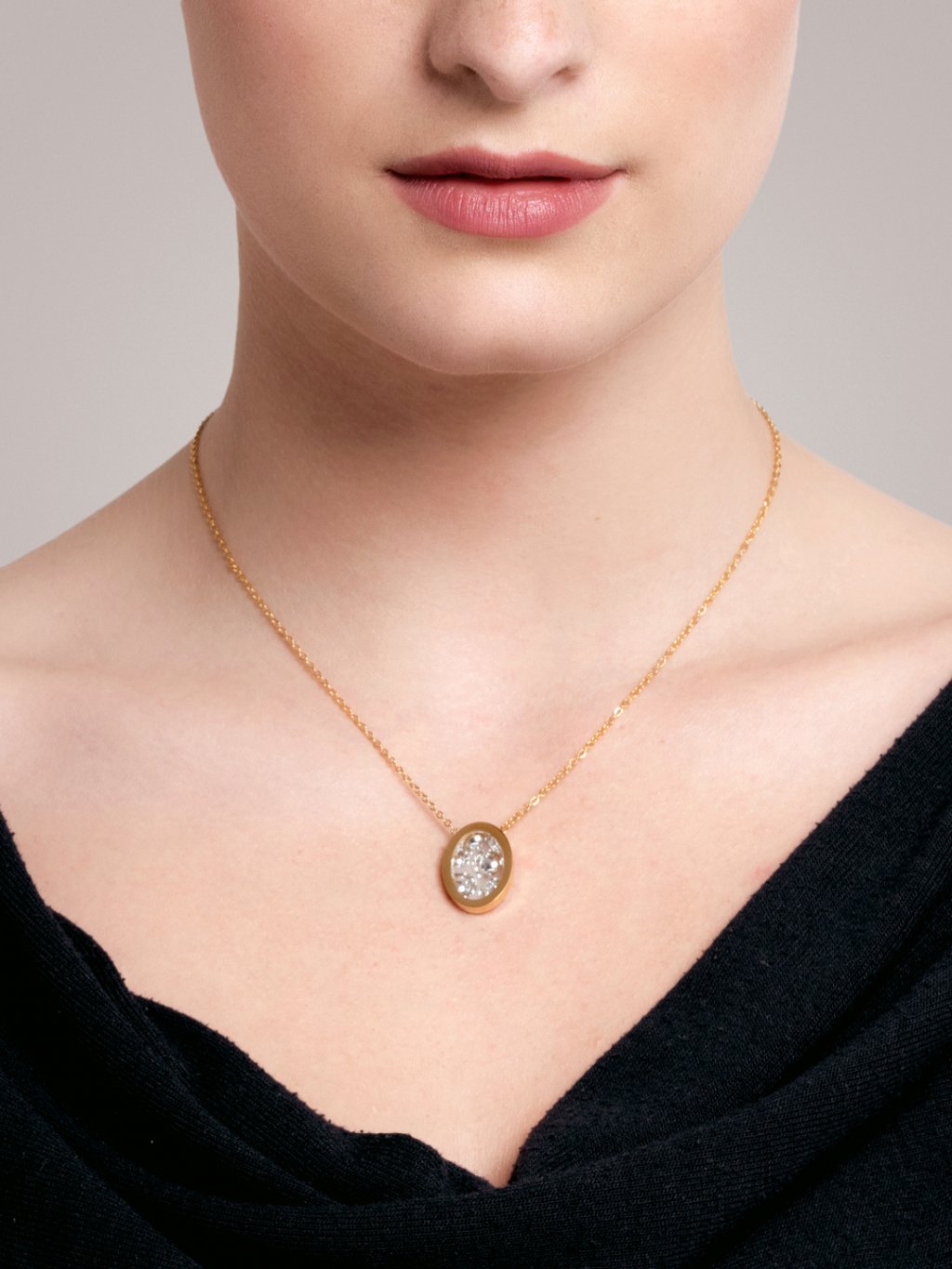 Náhrdelník Idared je vyroben z chirurgické oceli a speciálního kamene z českého křišťálu Preciosa. Ty v Preciose ručně mačkáme tradiční technologií z 18. století. Šperk má délku řetízku 40 cm. K němu je připojena 7 cm dlouhá adjusta, která umožní upravovat délku dle aktuální hloubky výstřihu.