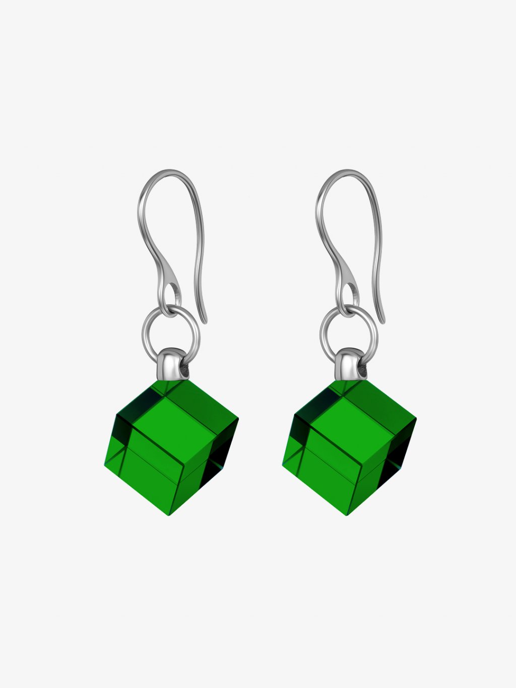 Mladistvé náušnice z chirurgické oceli v kombinaci s broušenými kameny českého křišťálu zelené barvy. Rozměr samotné krychličky je 10 x 10 mm.