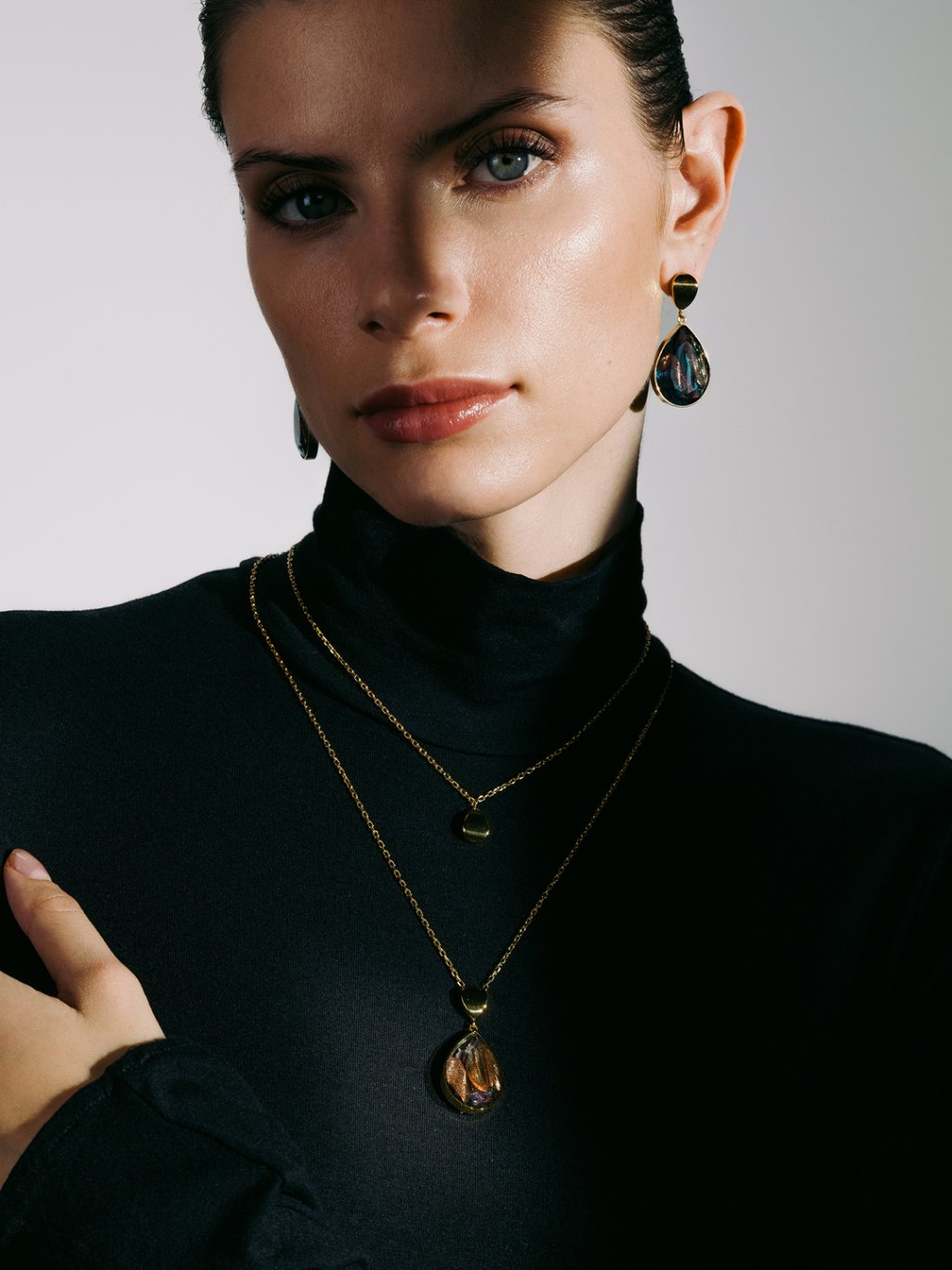 Šperk, který zachycuje kouzlo světelných odlesků a proměnlivé krásy přírody. Tento náhrdelník z kolekce Spotlight spojuje pozlacenou chirurgickou ocel s ručně mačkaným křišťálovým kamenem Preciosa. Každý kámen je originál a díky ruční výrobě má svůj jedinečný charakter.