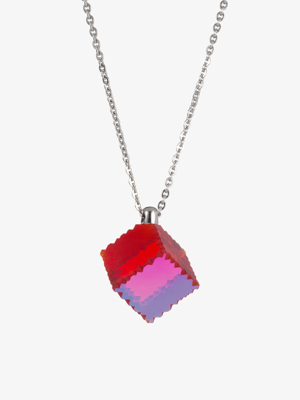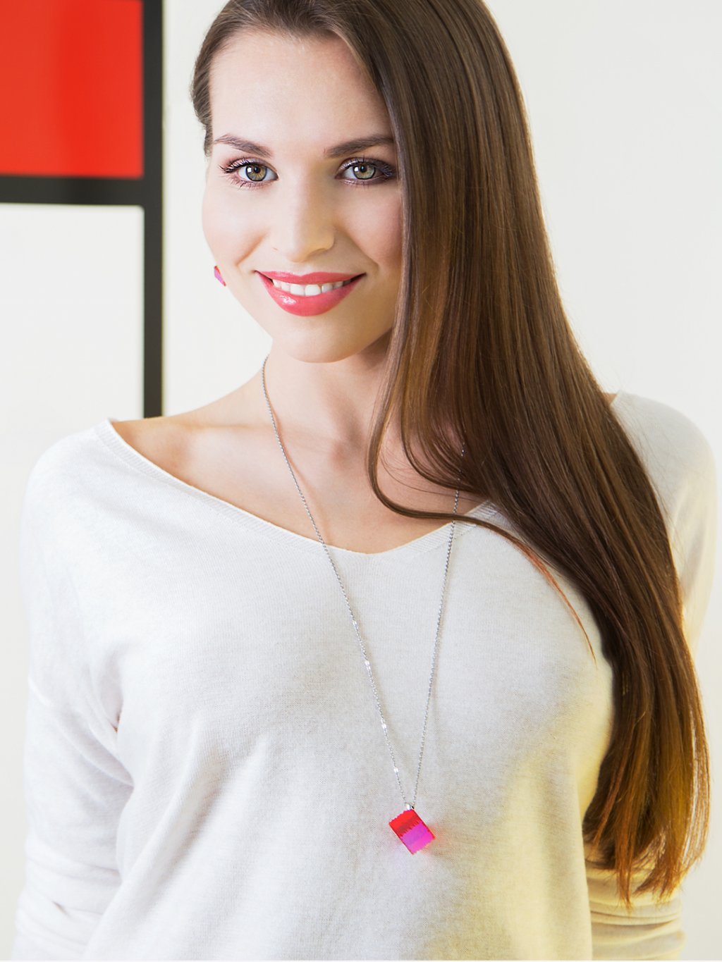 Jaclyn je módní přívěsek na dlouhém závěsu z chirurgické oceli ve tvaru kostky s unikátním speciálním dekorováním jejich hran. Její rudá barva symbolizuje radost ze života, životní energii a úspěch. Tento trendový šperk je ideálním módním doplňkem, který ozdobí podzimní outfit nejedné milovnice výrazných barev. Rozměr samotné krychličky je 15 x 15 mm.