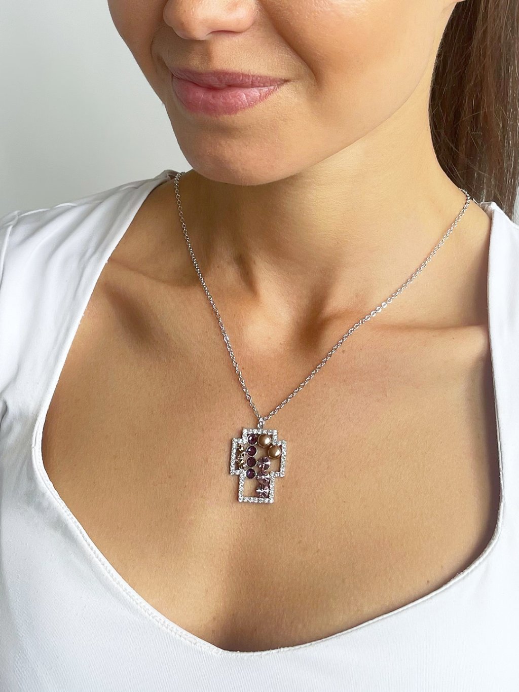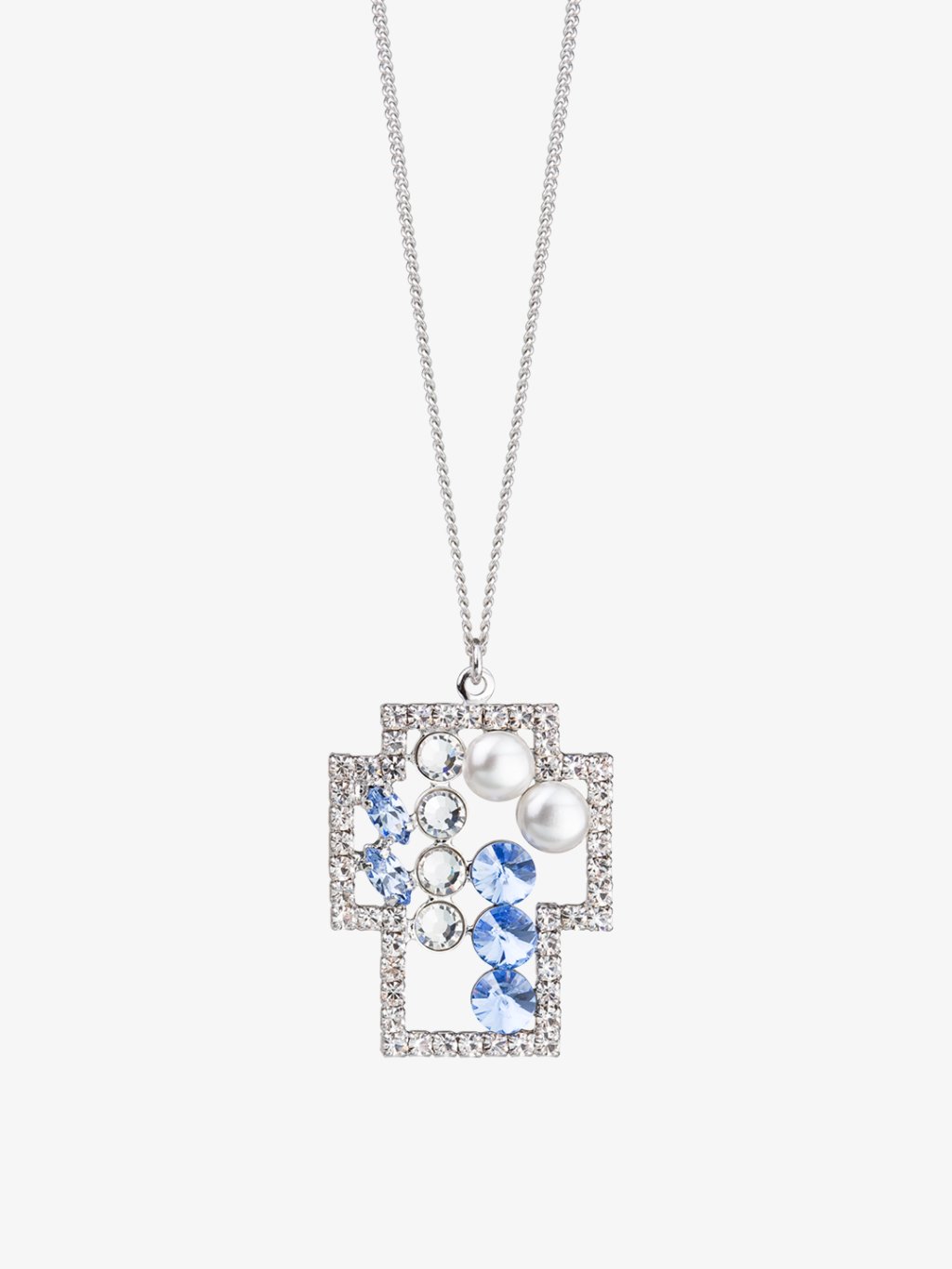 Přívěsek Orléans vás upoutá svým stylizovaným designem ve tvaru kříže. V něm se perfektně propojuje lesk broušených kamenů českého křišťálu s matem českých perliček. Samotný design šperku vás upoutá i unikátní barevnou kombinací světle safírové a bílé barvy.