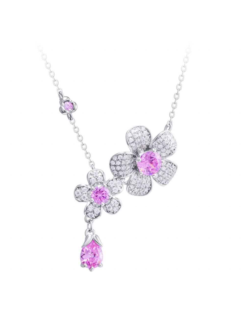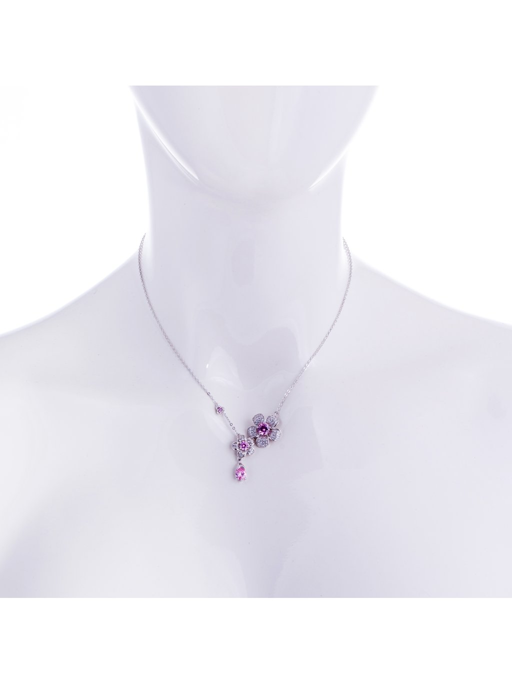 Design stříbrného šperku je lehce netradiční. Jednu jeho část tvoří rozvité květy klematisu z růžových a bílých kamenů kubické zirkonie, na straně druhé je pouze jemný řetízek dekorovaný růžovým kamenem. Celý design opticky vyrovnává růžová slza z kubické zirkonie Preciosa, která opticky prodlužuje celý stříbrný náhrdelník.